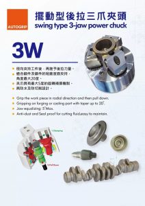 本屆獲獎產(chǎn)品「擺動型后拉三爪夾頭(3W)」系列是採用榮獲專利創(chuàng)新的球軸節(jié)式設(shè)計之特殊動力夾頭,當使用于夾持錐形鑄件,具有夾持補償與自定心功能。于夾持時, 可以徑向并同時下拉夾持工件。夾持鍛造或鑄造零件,錐度可達20°,夾持補償:最大5°。防塵,防切屑設(shè)計,節(jié)省成本并易于維護。